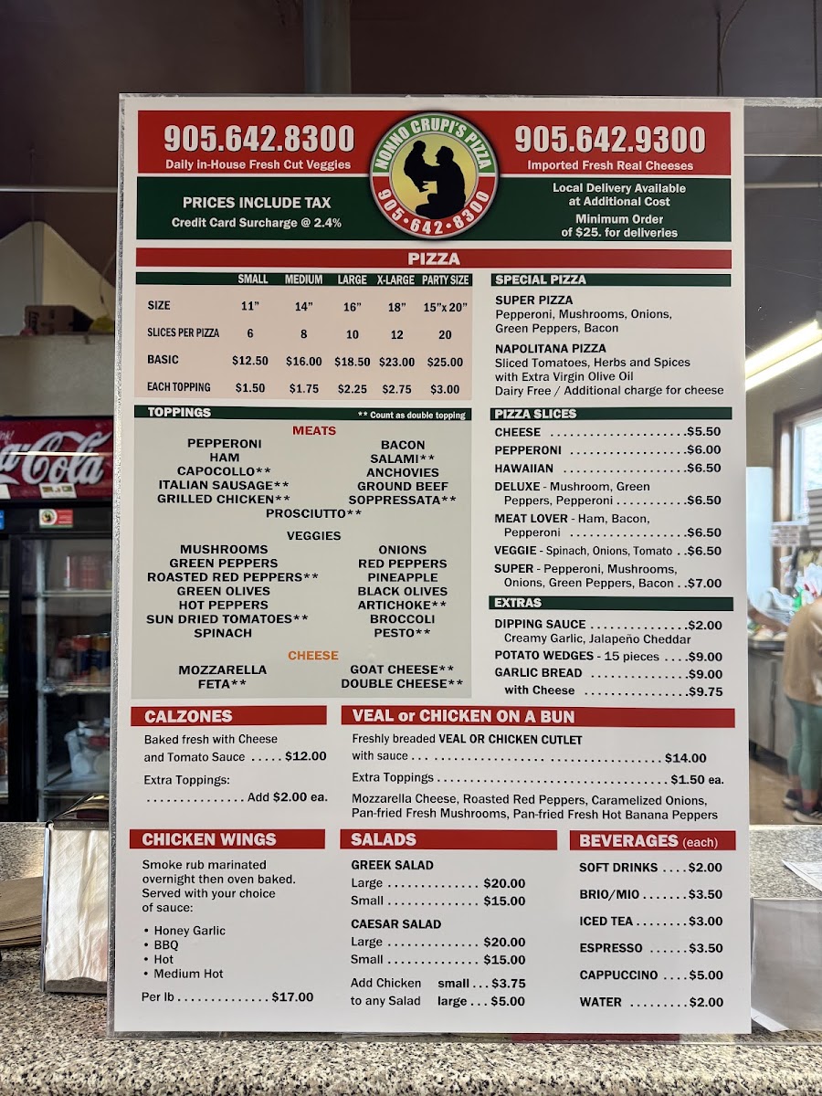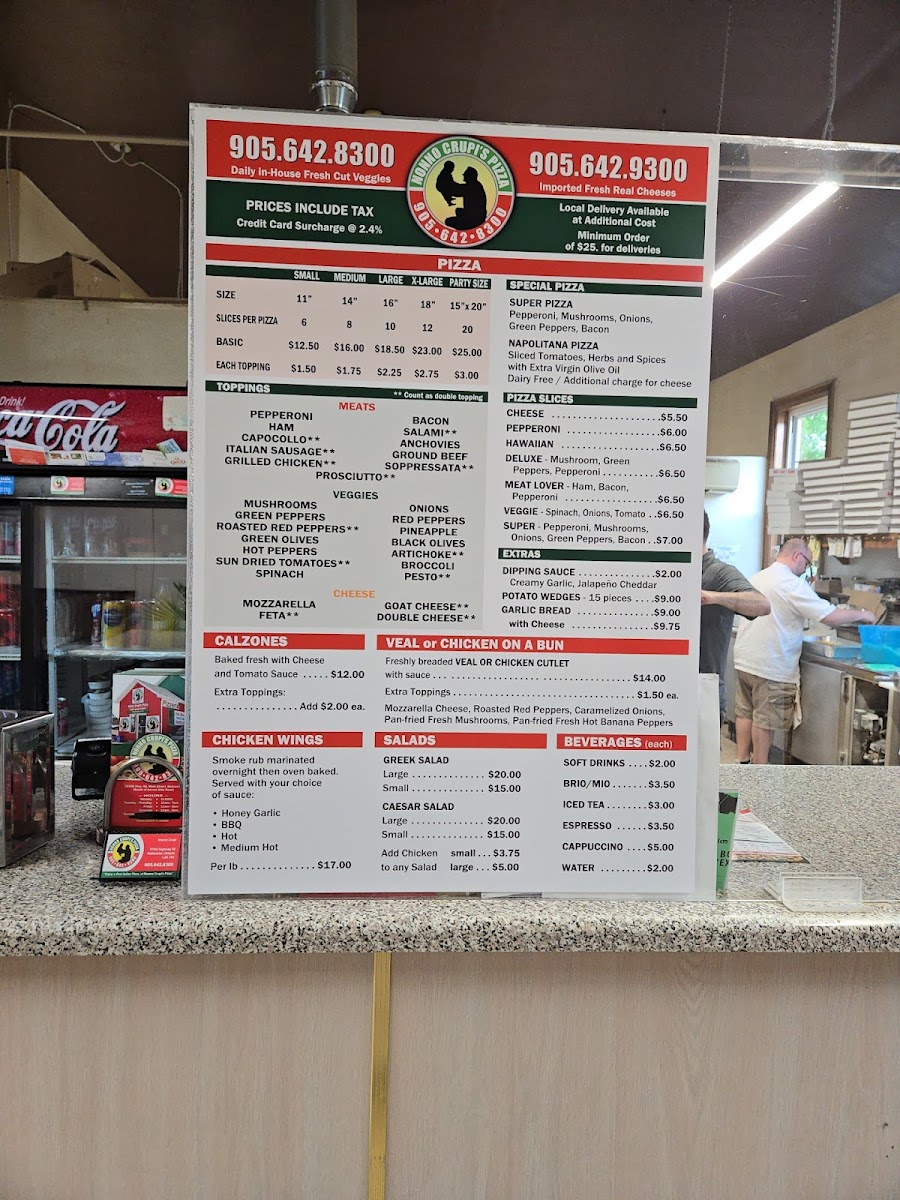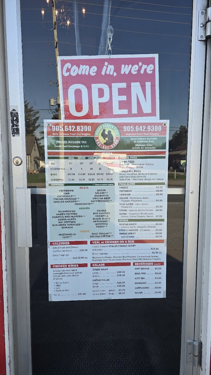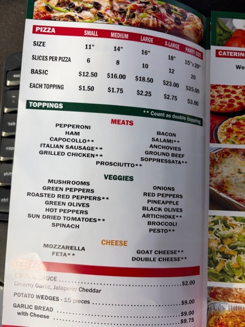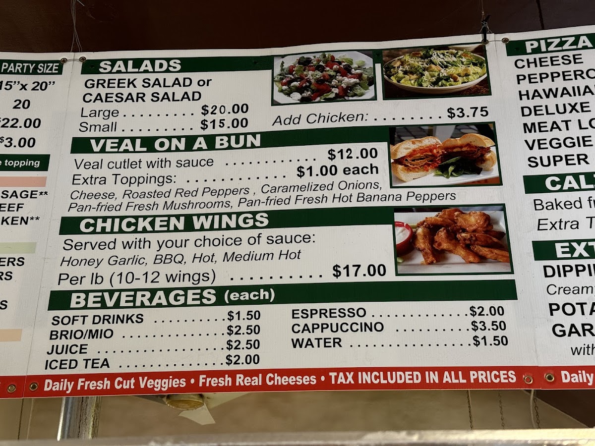 The menu features classic pizza choices, from small slices like the Veggie or Pepperoni to larger pies topped with combinations such as mushrooms, sopressata, or Canadian bacon. Calzones, baked fresh and generously filled, provide a warm and filling option for those who want something a bit more handheld. Alongside pizzas and calzones, you’ll find savory veal sandwiches and chicken wings that work well for lunch or an easy dinner.